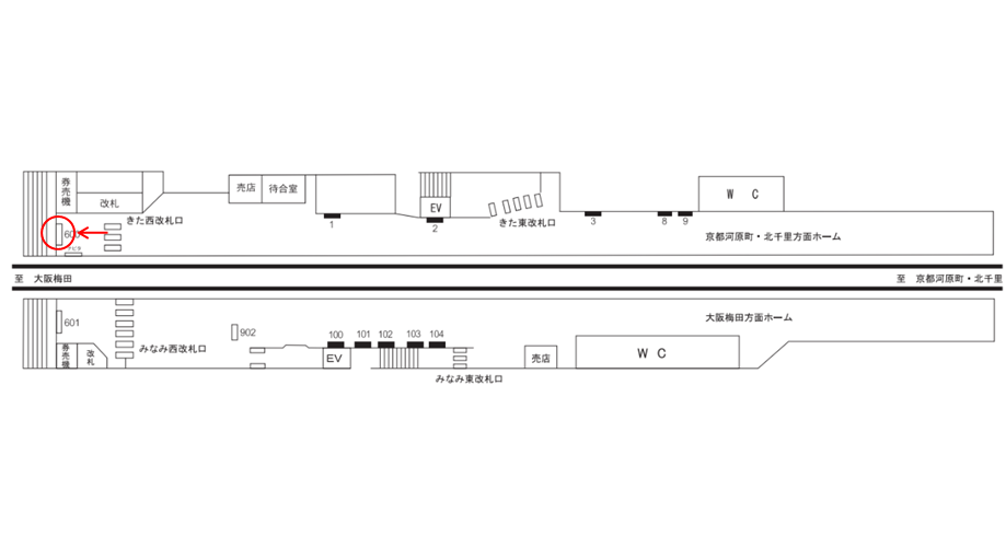 南方駅のホーム上にある広告看板です。淡路・茨木市・高槻市・京都河原町・北千里・嵐山方面の電車を待つ人に見てもらえます。