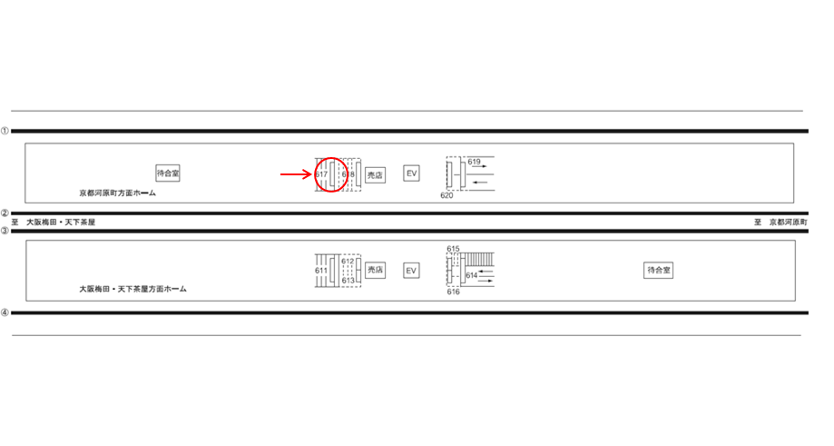 高槻市駅のホーム上にある広告看板です。長岡天神・桂・烏丸・京都河原町・嵐山方面ホームの電車を待つ人に見てもらえます。