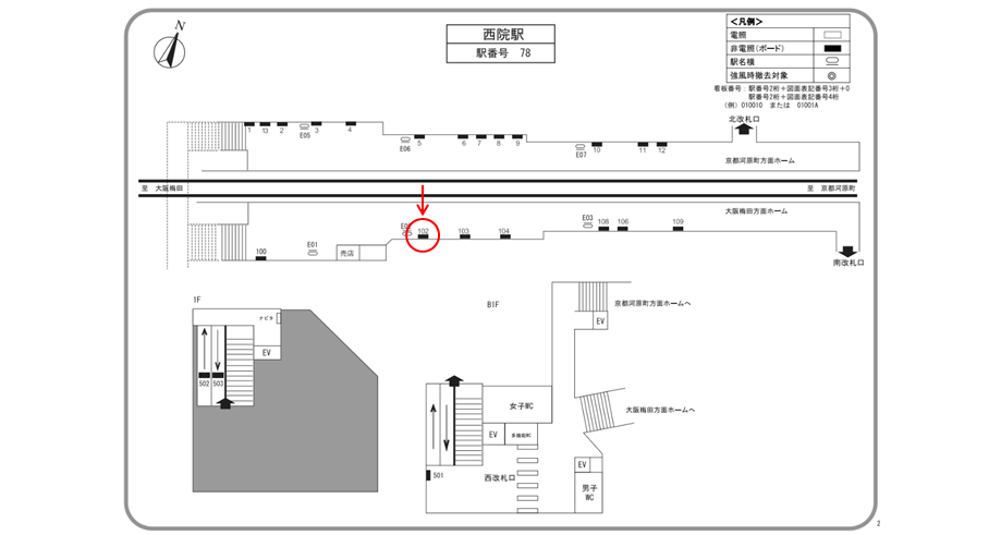 西院駅のホーム上にある広告看板です。桂・高槻市・大阪梅田・天下茶屋・北千里方面の電車を待つ人に見てもらえます。