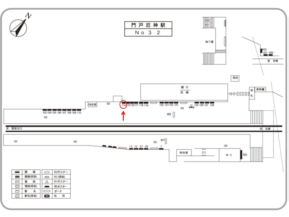 今津線宝塚方面ホームに設置された広告看板です。当ホーム利用客のみならず、向かい側の西宮北口方面ホームで電車待ちする利用客からも視認可能です。門戸厄神駅を日々利用される方へのご案内にご利用ください。