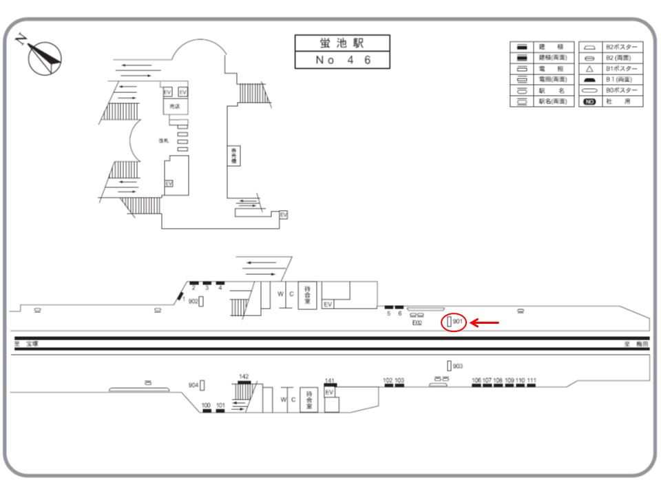 梅田方面ホーム上部の路線図横に設置された電飾広告看板です。当ホームの乗降客が対象で、自然と目が行く路線図横に位置するため、注目されやすい看板です。蛍池駅を日々利用される方へのご案内にご利用ください。
