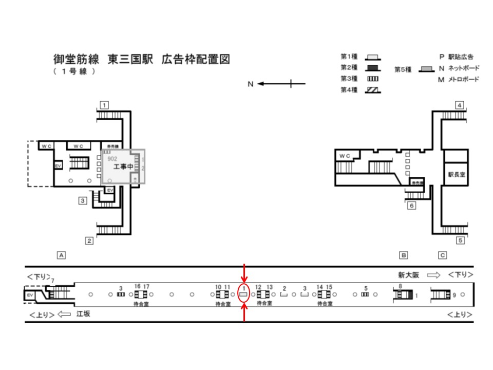 御堂筋線北行き(江坂方面)/南行き(梅田・なんば方面)どちらからも視認可能な両面型の看板です。東三国駅を日々利用される方へのご案内にご利用ください。