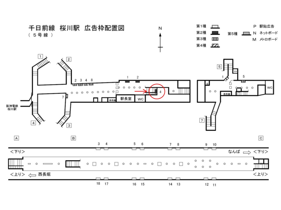 桜川駅西改札コンコースとホームを繋ぐ階段の見附部分に設置された電飾広告看板です。千日前線に乗車する利用者に正面から見えてくるロケーションです。