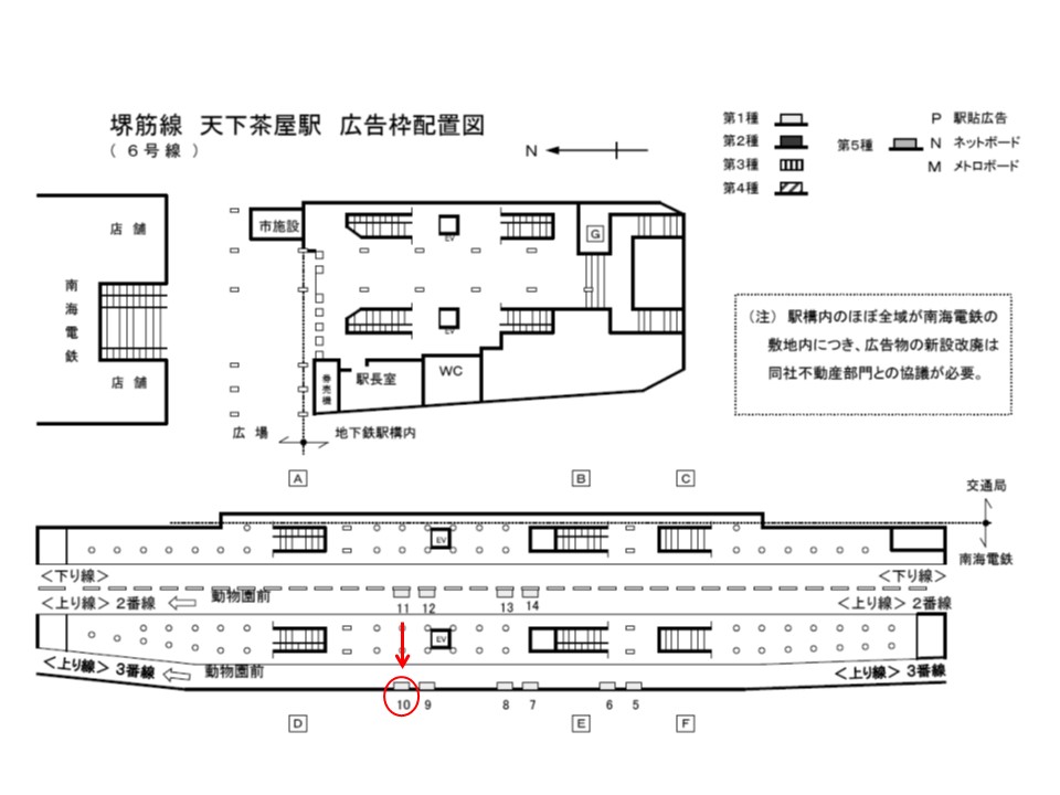 地下鉄堺筋線天下茶屋駅、ホームの駅広告(駅看板)設備のご紹介です。