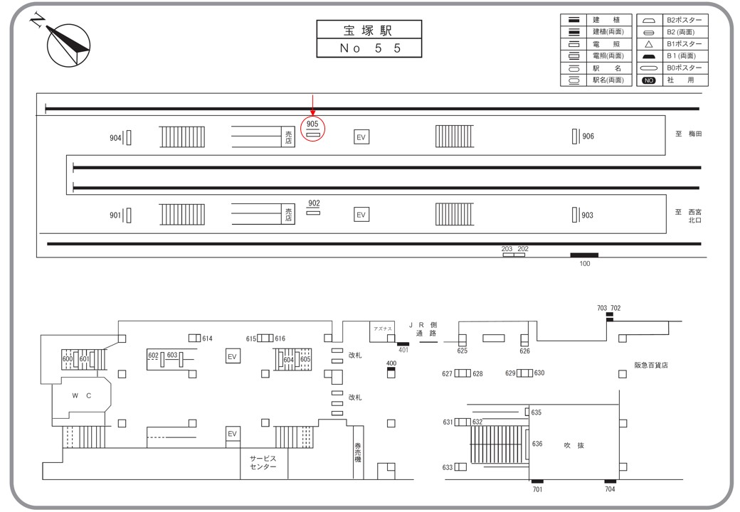 宝塚駅の梅田方面行きホーム上部路線図横に設置された広告看板です。