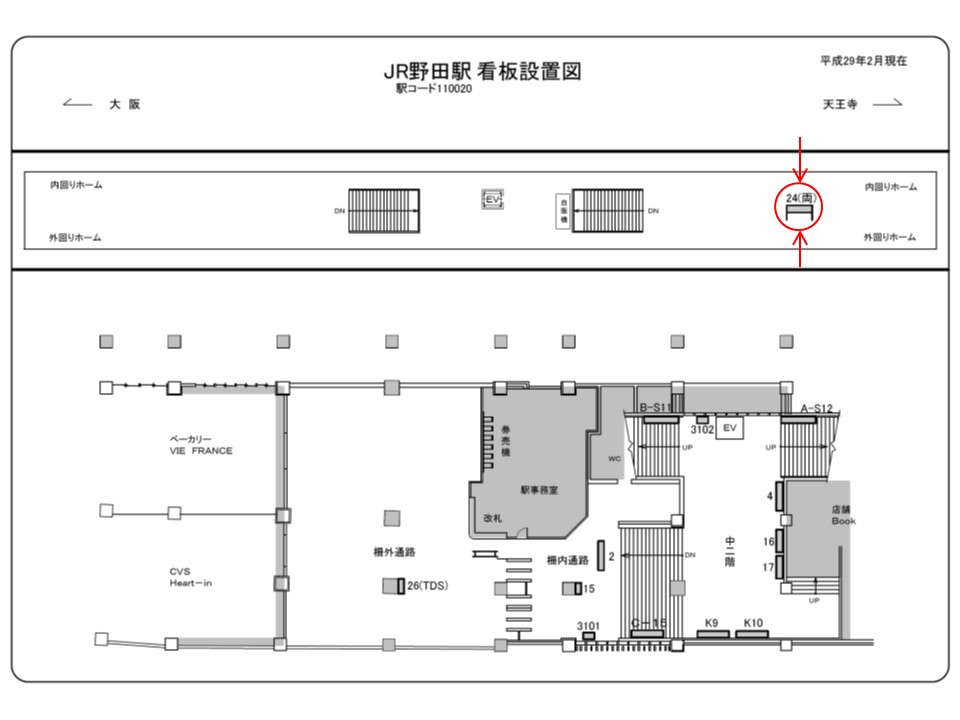 ホーム上に両面型に設置されているため、内回り・外回り電車のどちらからもご覧になれる看板です。野田駅を日々利用される方へのご案内にご利用ください。