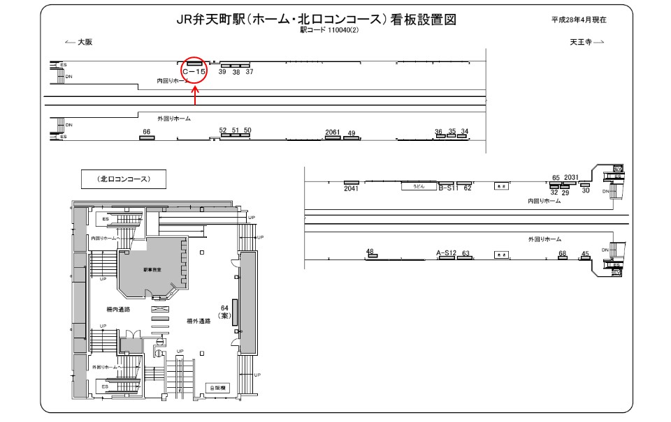 内回りホームで電車をお待ちの方々、対面の外回りホーム(西九条・大阪方面)にて電車をお待ちの方がにも訴求することができます。弁天町駅にて長期的な駅広告をご検討中の方にお勧めいたします。
